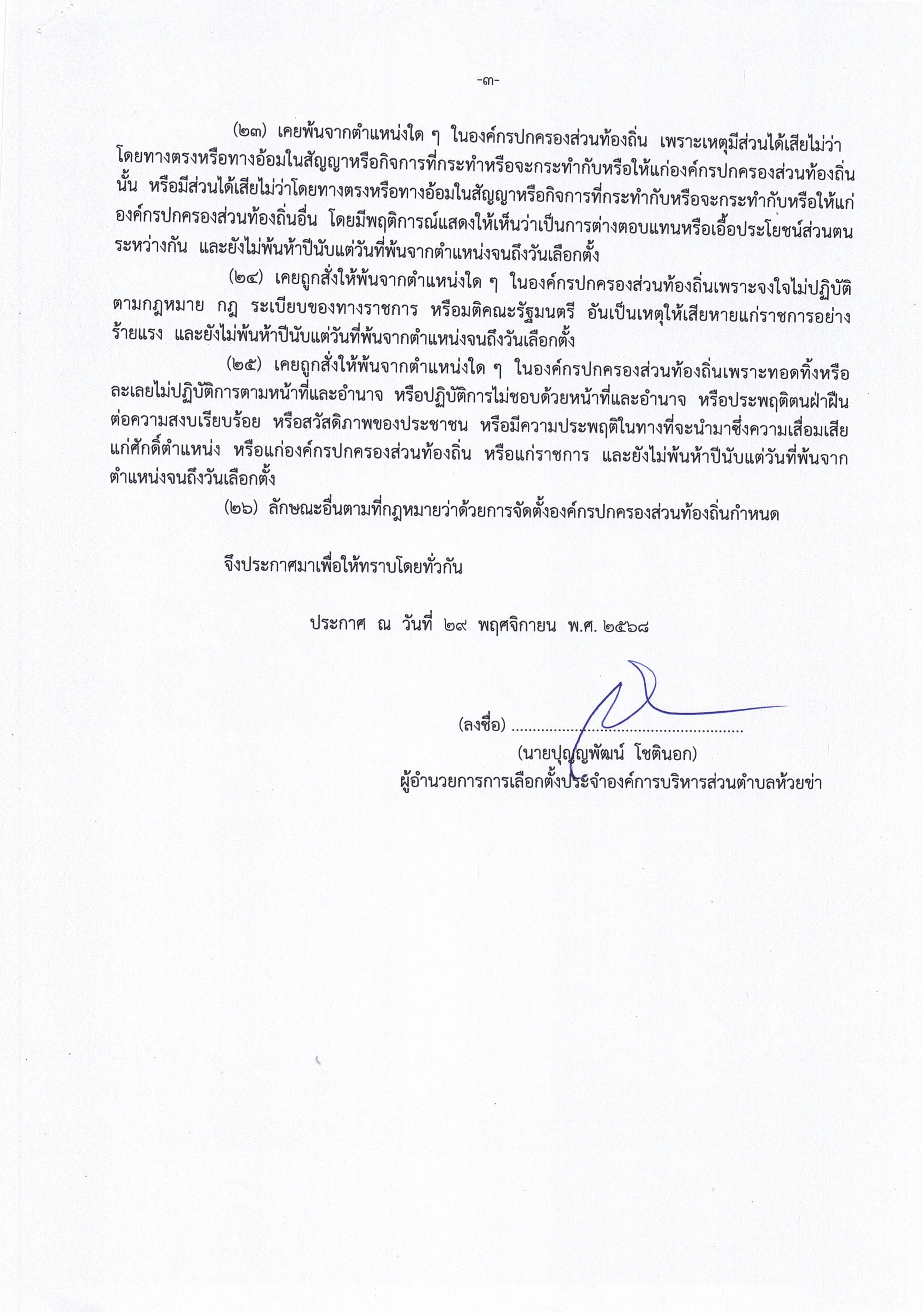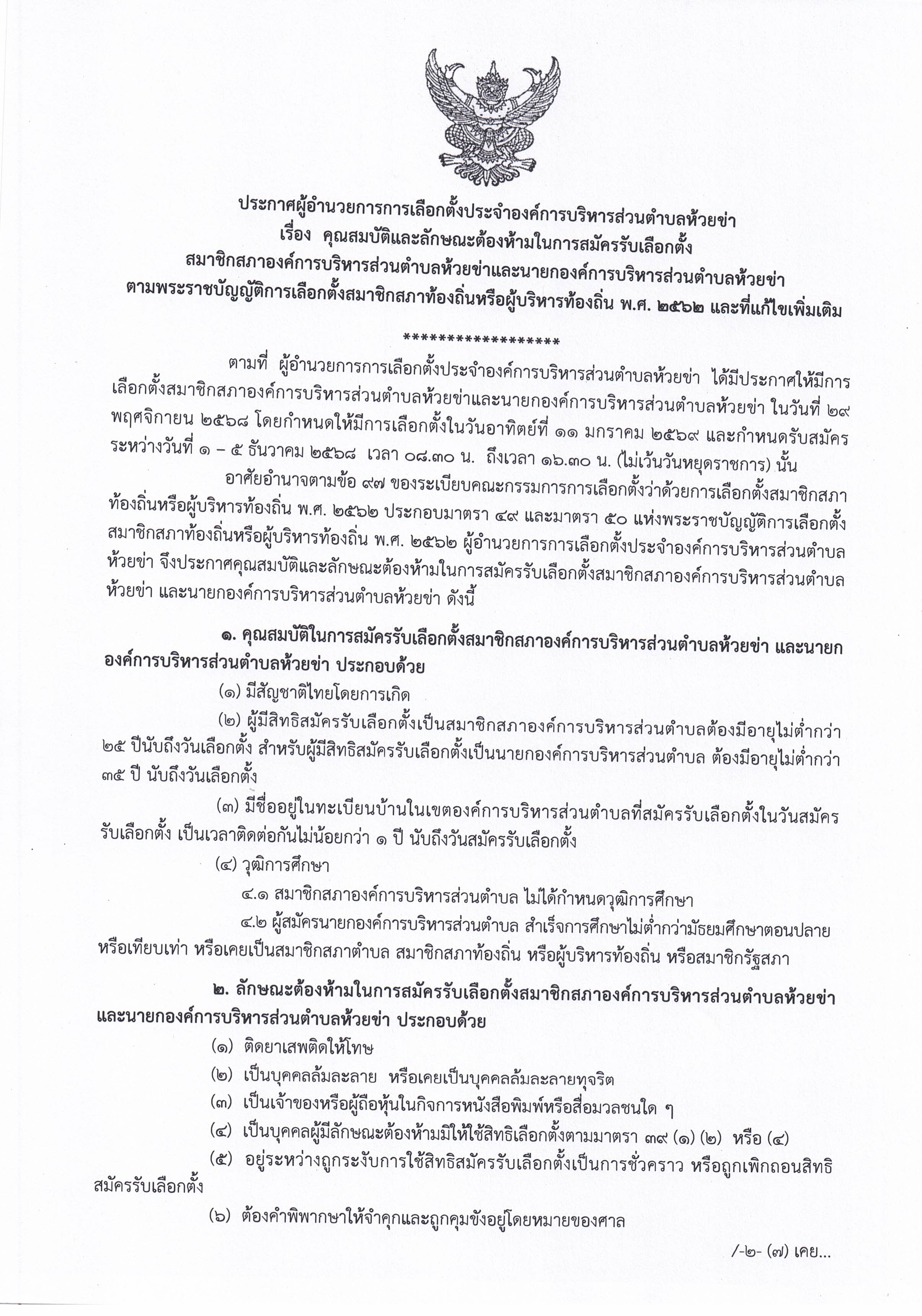 ประกาศผู้อำนวยการการเลือกตั้งประจำองค์การบริหารส่วนตำบลห้วยข่า เรื่อง คุณสมบัติและลักษณะต้องห้ามในการสมัครรับเลือกตั้ง สมาชิกสภาองค์การบริหารส่วนตำบลห้วยข่าและนายกองคืการบริหารส่วนตำบลห้วยข่า ตามพระราชบัญญัติการเลือกตั้งสมาชิกสภาท้องถิ่น