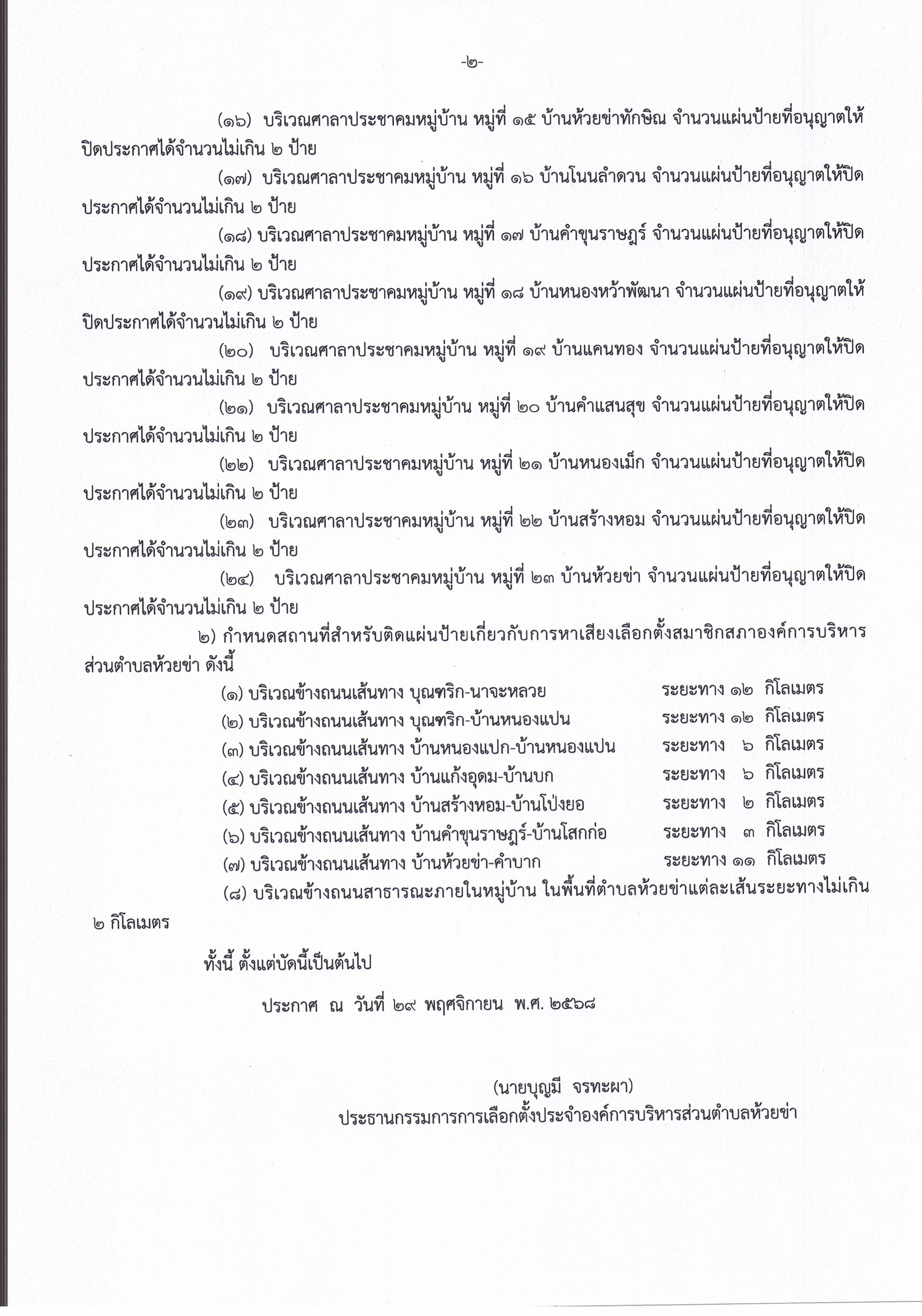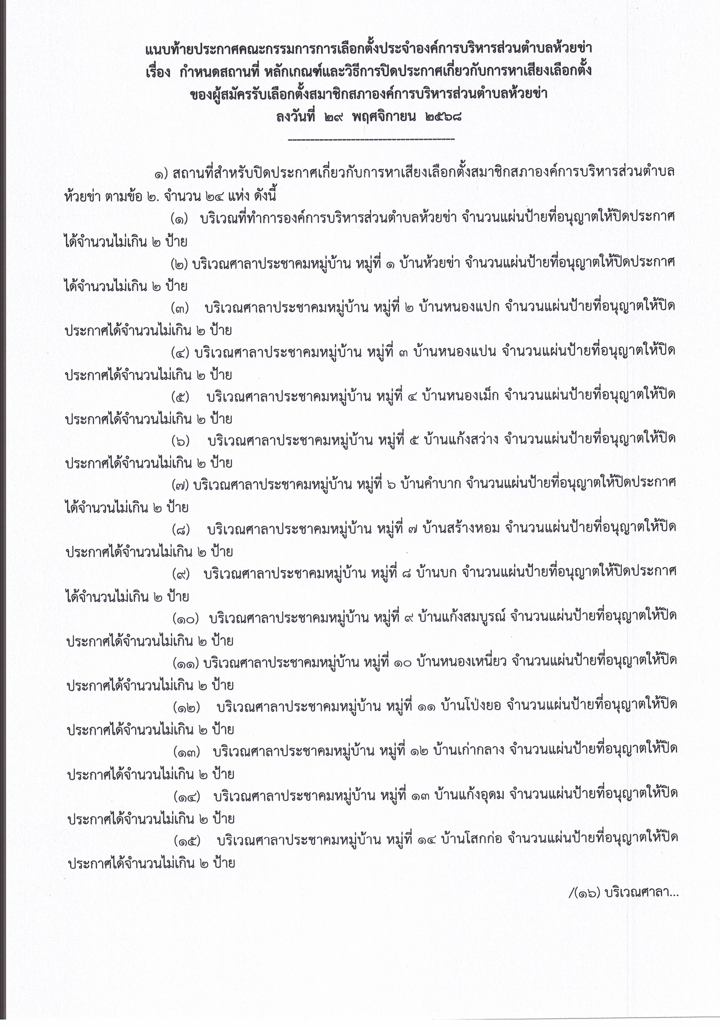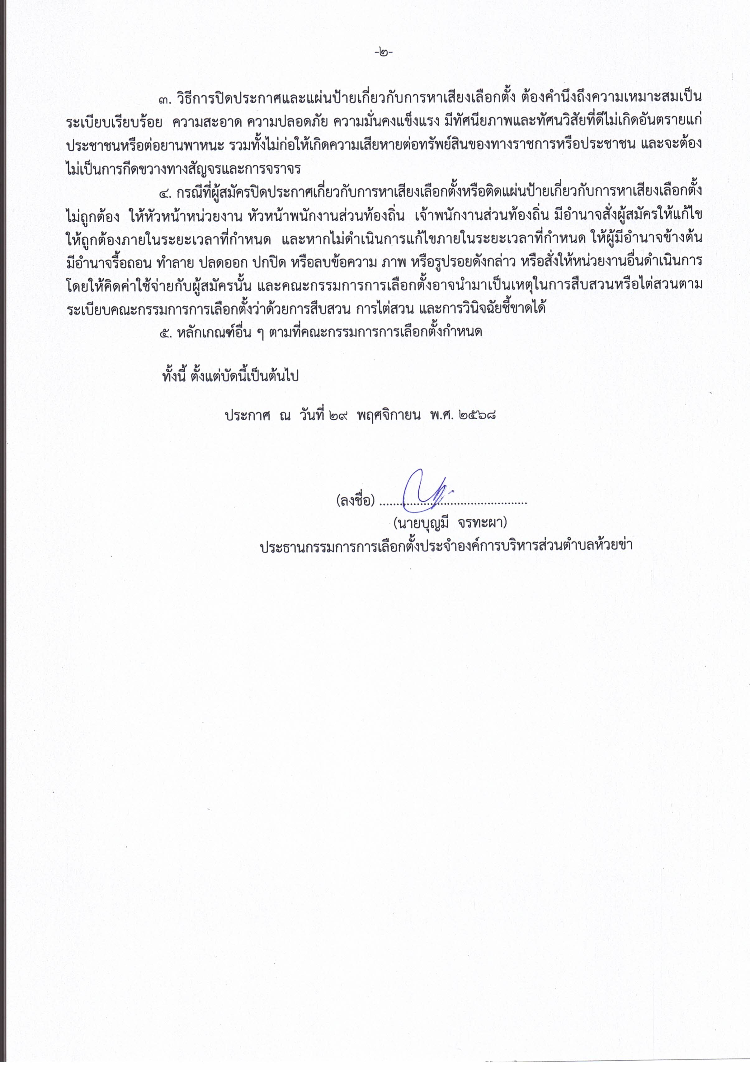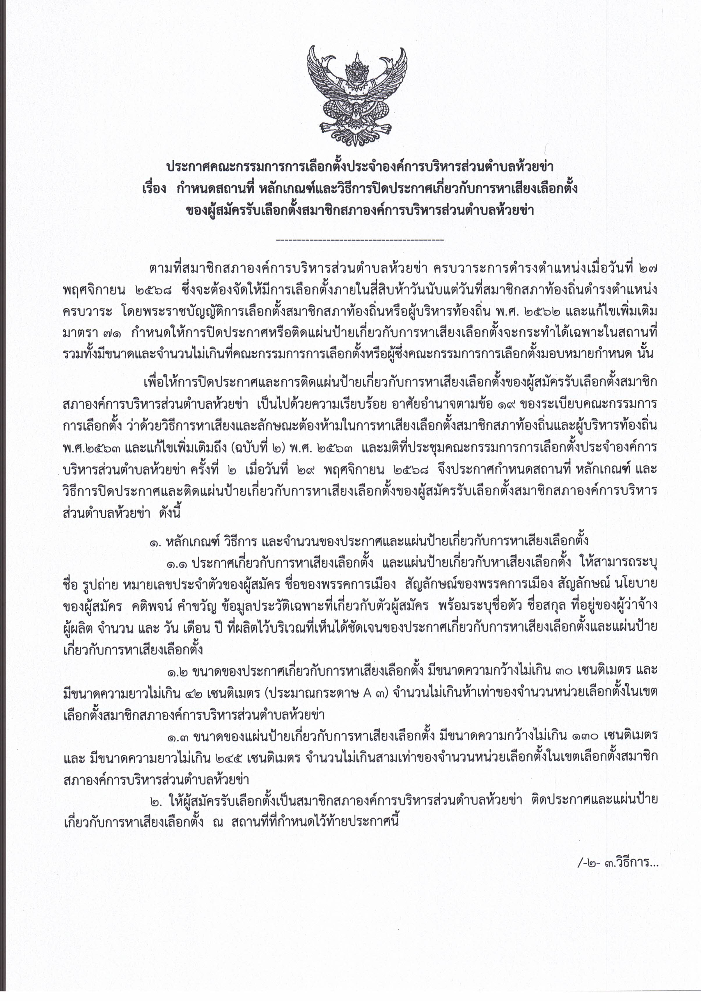 ประกาศคณะกรรมการการเลือกตั้งประจำองค์การบริหารส่วนตำบลห้วยข่า เรื่อง กำหนดสถานที่ หลักเกณฑ์และวิธีการปิดประกาศเกี่ยวกับการหาเสียงเลือกตั้งของผู้สมัครรับเลือกตั้งสมาชิกสภาองค์การบริหารส่วนตำบลห้วยข่า