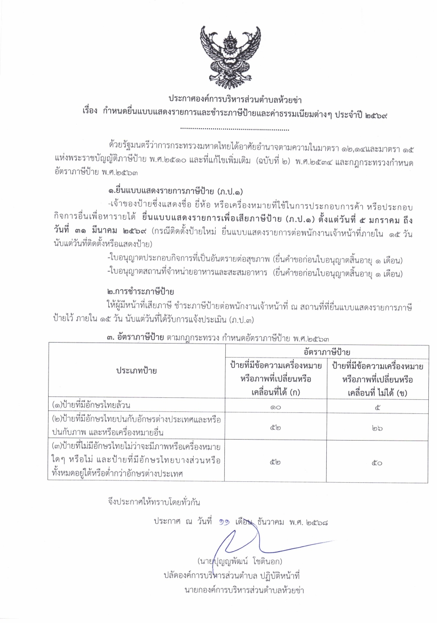 ประกาศองค์การบริหารส่วนตำบลห้วยข่า เรื่อง กำหนดยื่นแบบแสดงรายการและชำระภาษีป้ายและค่าธรรมเนียมต่าง ประจำปี 2569