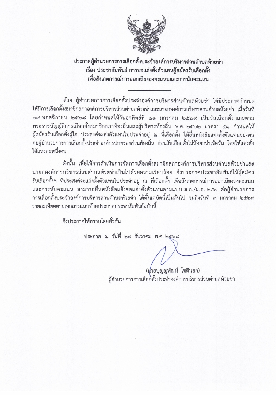 ประกาศผู้อำนวยการเลือกตั้งประจำองค์การบริหารส่วนตำบลห้วยข่า เรื่อง ประชาสัมพันธ์ การขอแต่งตั้งตัวแทนผู้สมัครรับเลือกตั้งเพื่อสังเกตการณ์การออกเสียงลงคะแนนและการนับคะแนน