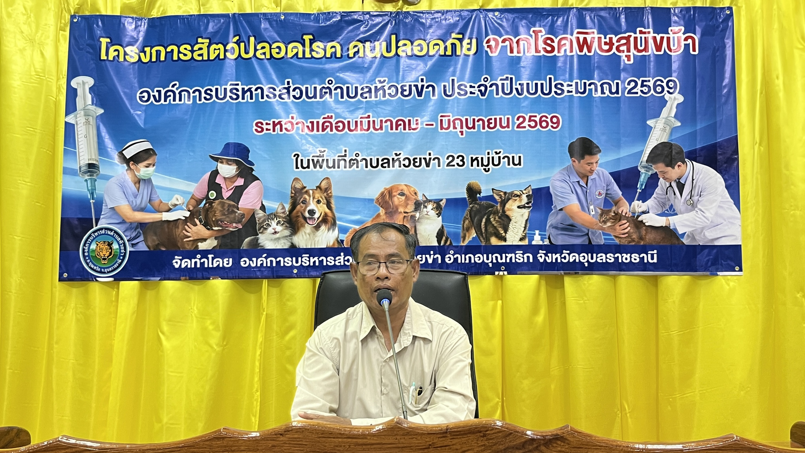 วันพุธที่ 25 มีนาคม 2569 นายสมาน ต้นเกษ นายกองค์การบริหารส่วนตำบลห้วยข่า เป็นประธานในพิธีเปิดโครงการสัตว์ปลอดโรค คนปลอดภัย จากพิษสุนัขบ้า องค์การบริหารส่วนตำบลห้วยข่า ประจำปีงบประมาณ 2569 ระหว่างเดือน มีนาคม - มิถุนายน 2569 ในพื้นที่ตำบลห้วยข่า 23