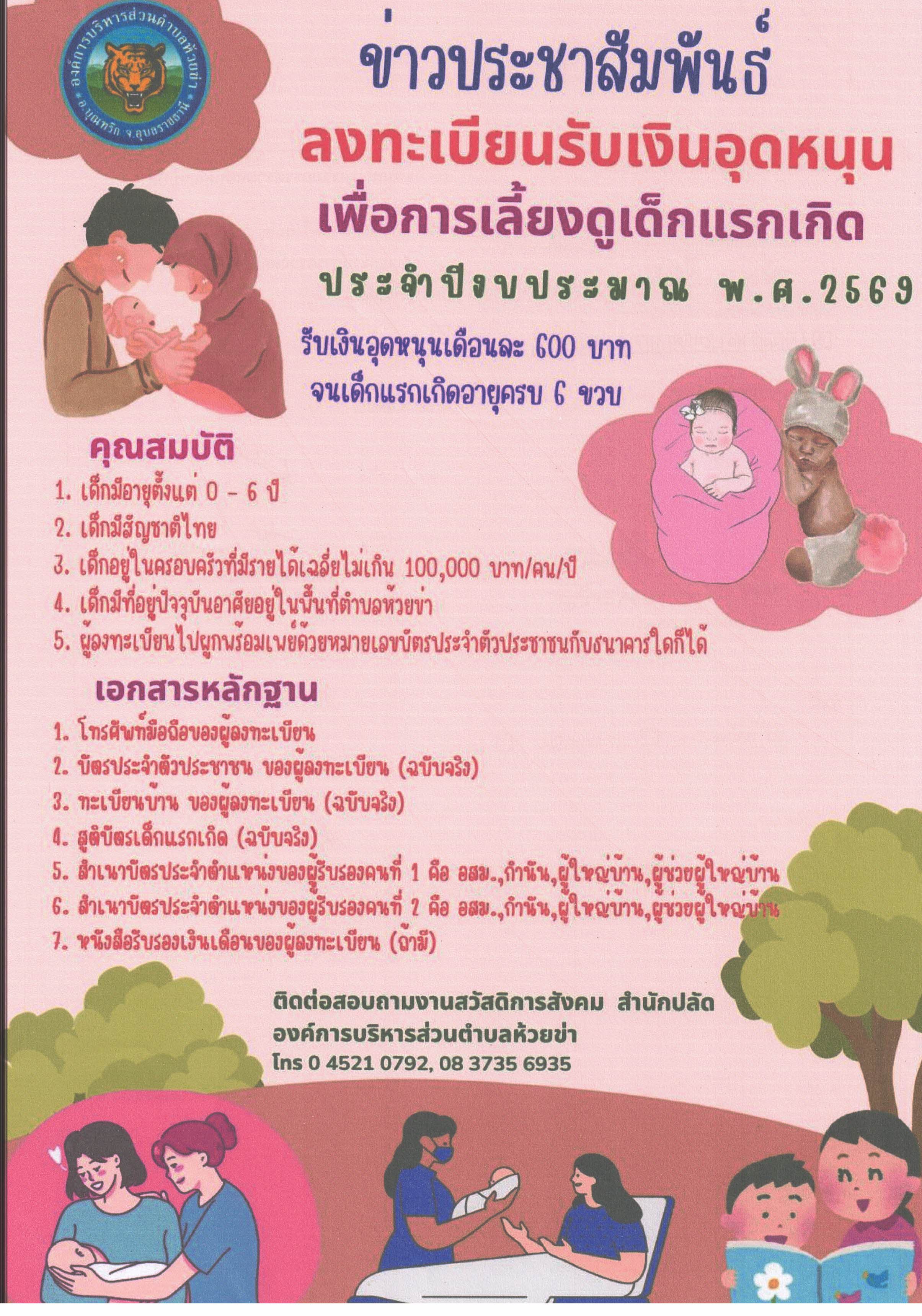 ขอแจ้งข่าวประชาสัมพันธ์ลงทะเบียนรับเงินอุดหนุนเพื่อการเลี้ยงดูเด็กแรกเกิดประจำปีงบประมาณพ.ศ. 2569 รับเงินอุดหนุนเดือนละ 600 บาทจนเด็กแรกเกิดอายุครบหกขวบคุณสมบัติตามเอกสารนี้นะคะ ติดต่อสอบถามงานสวัสดิการสังคมสำนักปลัดองค์การบริหารส่วนตำบลห้วยค่ะ โทร 045-210792 ,083-7356935