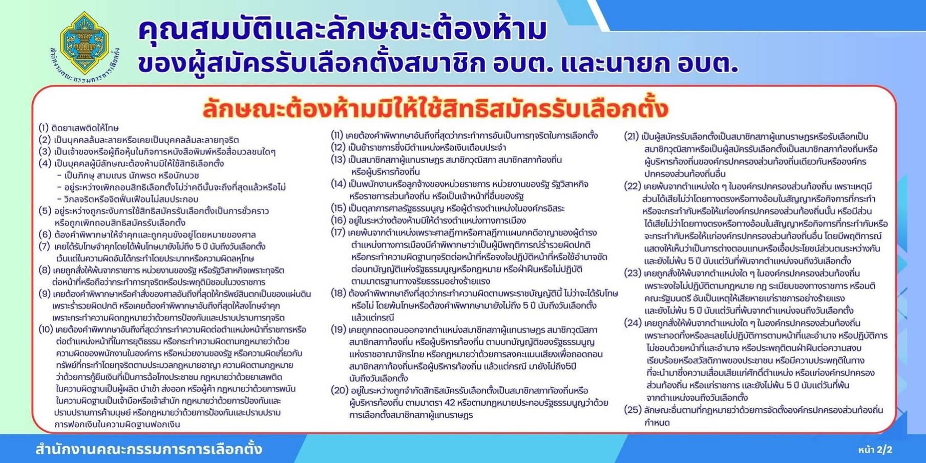ขอแจ้งประชาสัมพันธ์คุณสมบัติและลักษณะต้องห้ามของผู้สมัครรับเลือกตั้งสมาชิกสภาองค์การบริหารส่วนตำบล และนายกองค์การบริหารส่วนตำบล
