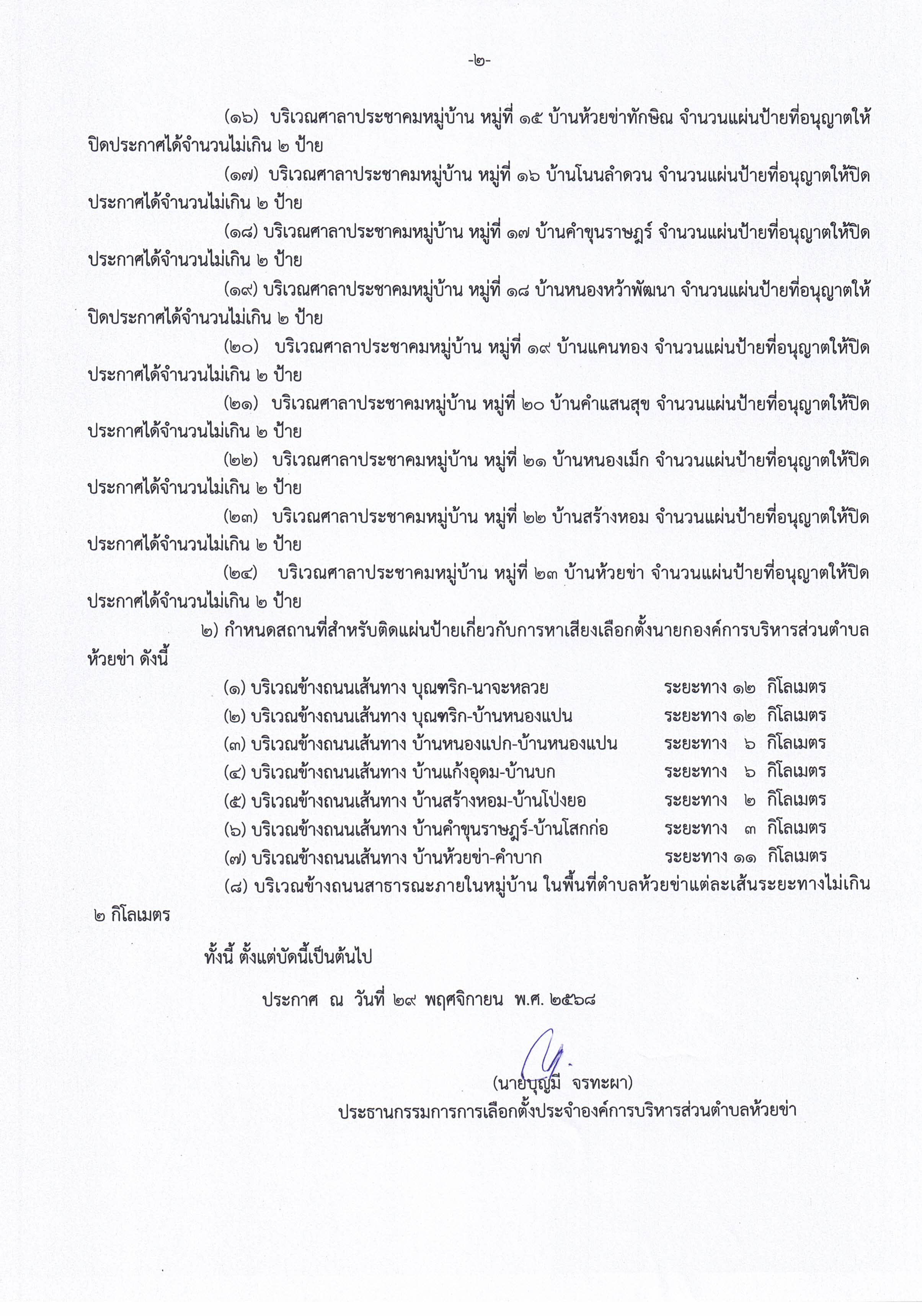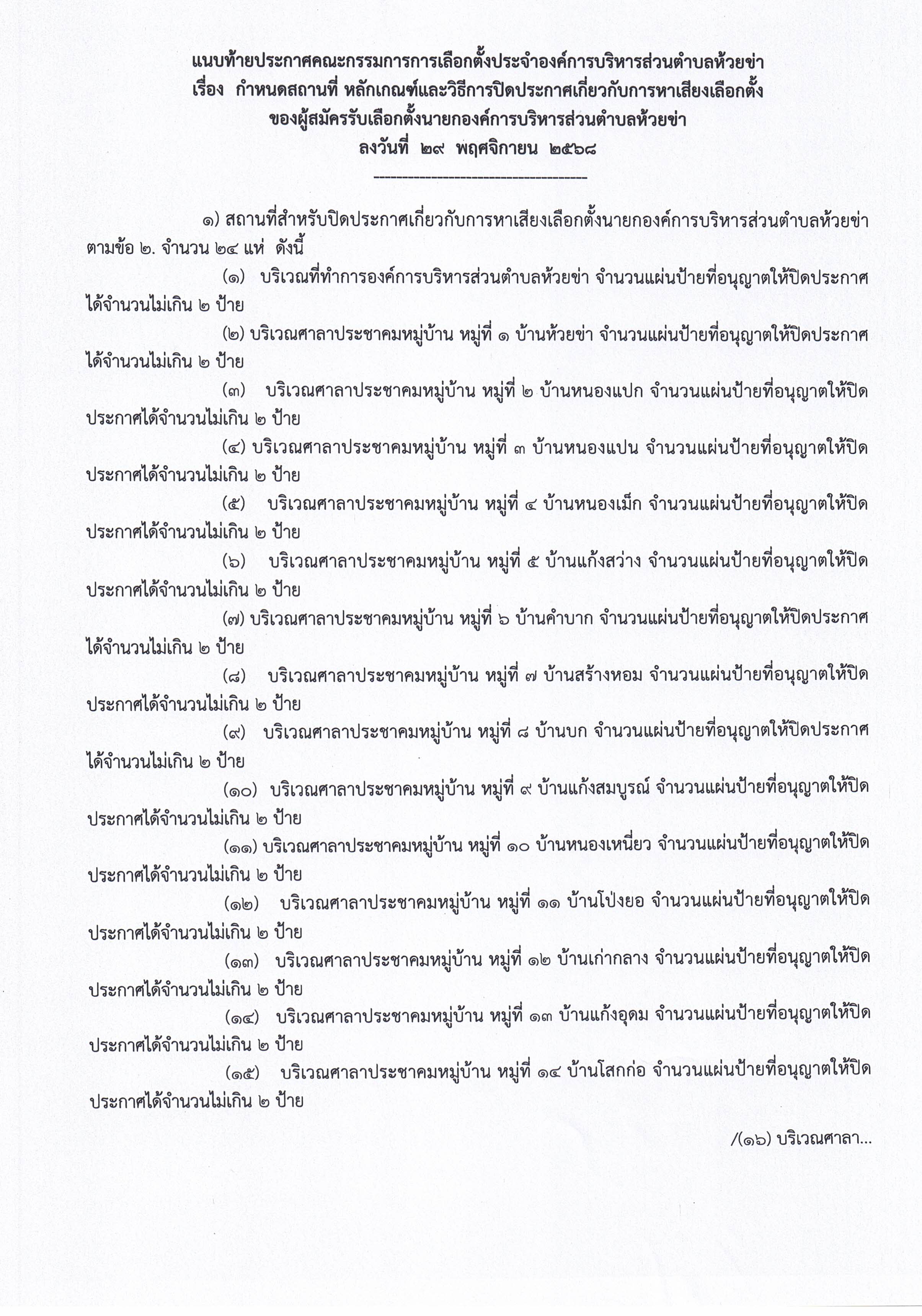 ประกาศคณะกรรมการการเลือกตั้งประจำองค์การบริหารส่วนตำบลห้วยข่า เรื่อง กำหนดสถานที่ หลักเกณฑ์และวิธีการปิดประกาศเกี่ยวกับการหาเสียงเลือกตั้งของผู้สมัครรับเลือกตั้งนายกองค์การบริหารส่วนตำบลห้วยข่า