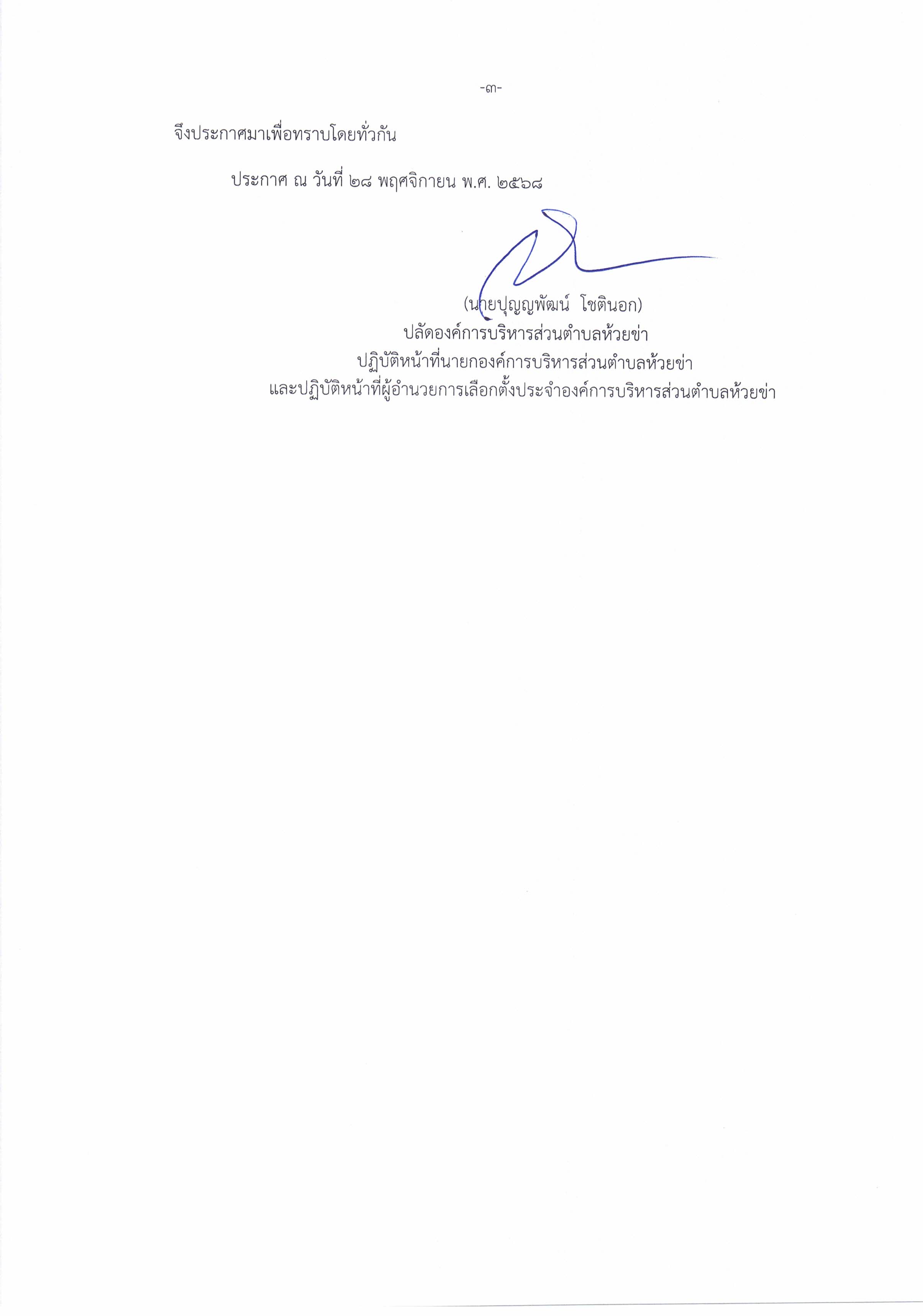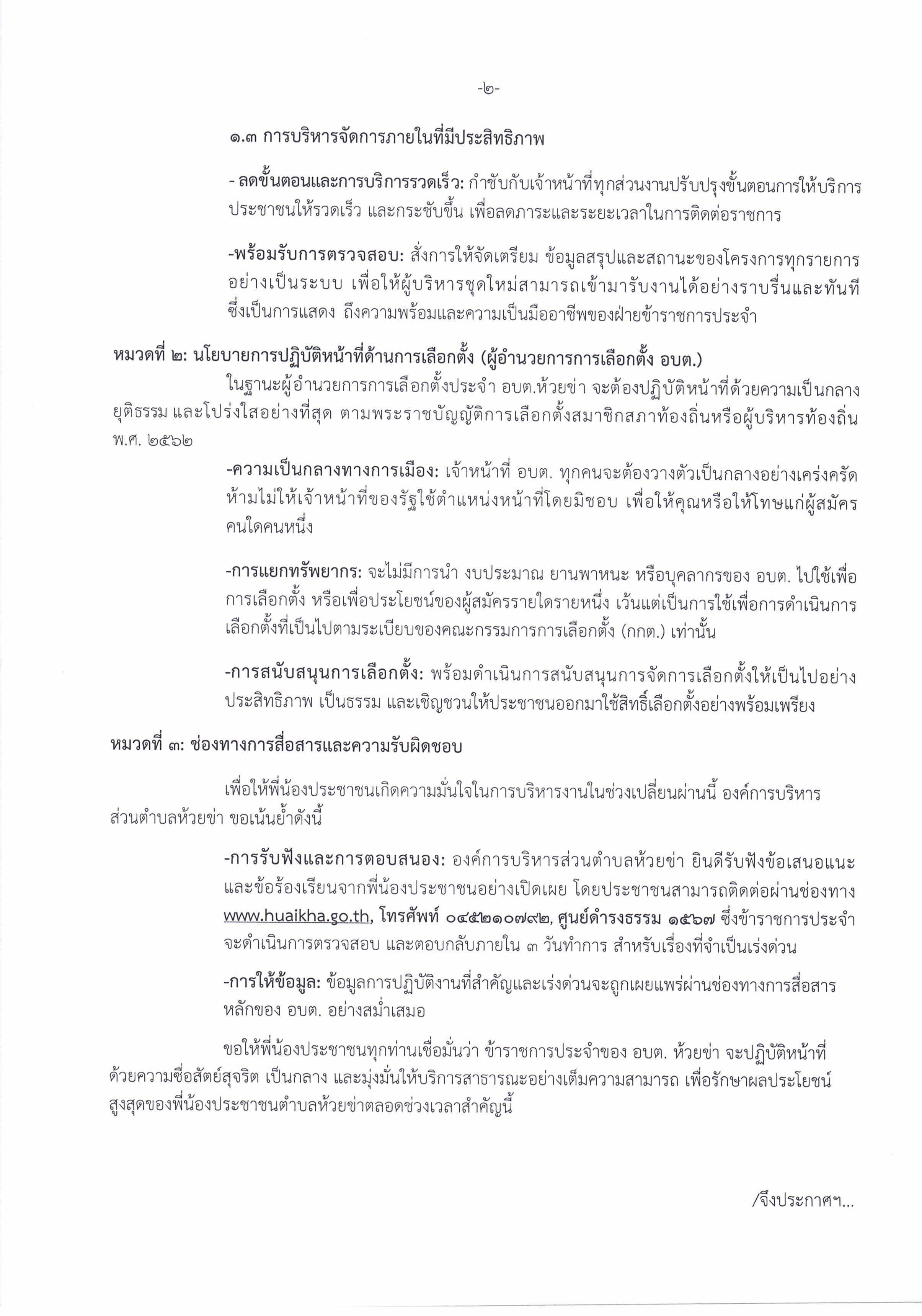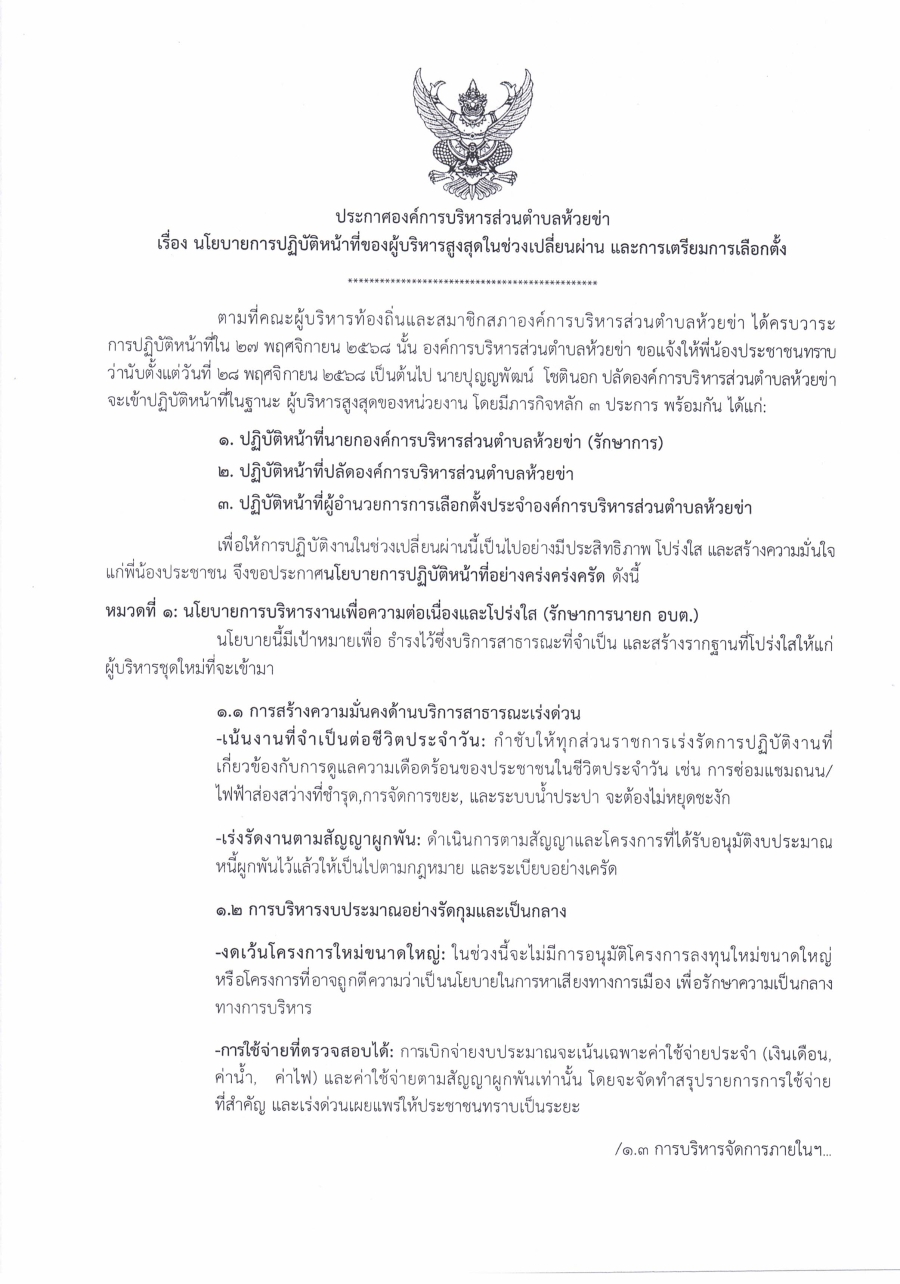 ประกาศองค์การบริหารส่วนตำบลห้วยข่า เรื่อง นโยบายการปฏิบัติหน้าที่ของผู้บริหารสูงสุดในช่วงเปลี่ยนผ่าน และการเตรียมการเลือกตั้ง