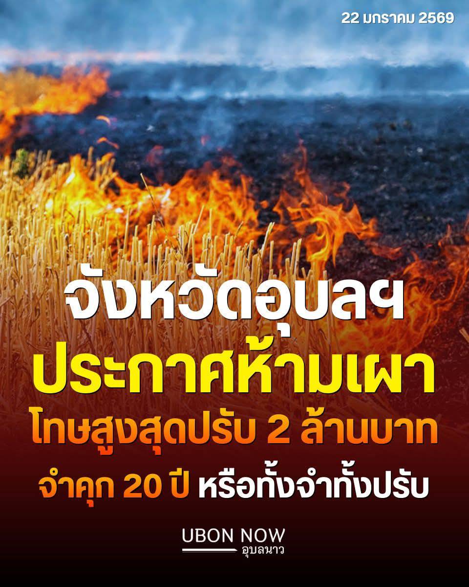 ประกาศประชาสัมพันธ์ วันที่ 1 กุมภาพันธ์ 2569 ถึง 31 มีนาคม 2569 "ห้ามเผาในพื้นที่การเกษตรทุกรณี" เกษตรกรที่มีประวัติการเผาในช่วงเวลาดังกล่าว "จะไม่ได้รับสิทธิ์" เข้าร่วมโครงการสนับสนุนหรือช่วยเหลือต่างๆ ของกระทรวงเกษตรฯ ทุกโครงการเป็นเวลา 2 ปี